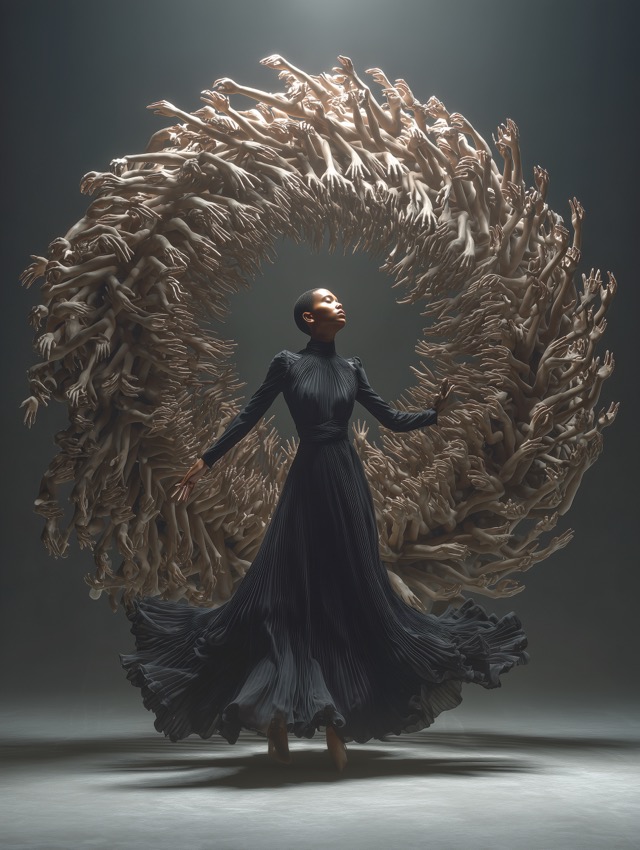 この作品について 最初に見てほしいのは、中央で静かに立つ黒いドレスの人物と、その背後で巨大な円を形づくる無数の腕の対比です。視線が自然に集まるのは、人物の落ち... -