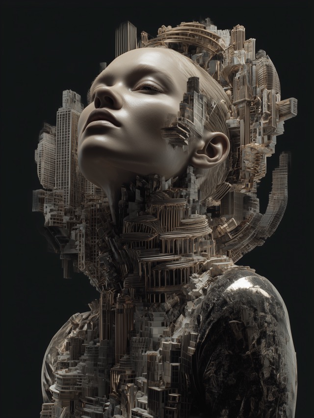 この作品について 見る人の視線を最初につかむのは、上を向いた無機質な顔立ちと、その頭部から都市が増殖するように立ち上がる異様な構造です。人のポートレートとして... -