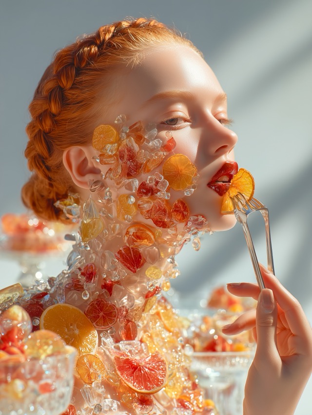 この作品について 視線を奪うのは、果実をまとうように立ち上がる身体の質感です。赤みのある編み込みヘアと透けるような肌の上に、オレンジやグレープフルーツの輪切り... -