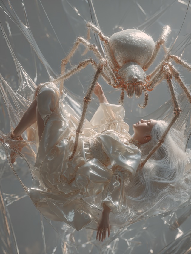 この作品について 視界に入った瞬間に息を止めたくなる一枚です。理由は、白銀の長い髪を広げた女性の静かな美しさと、その上に覆いかぶさる巨大な蜘蛛の気配が、同じ画... -