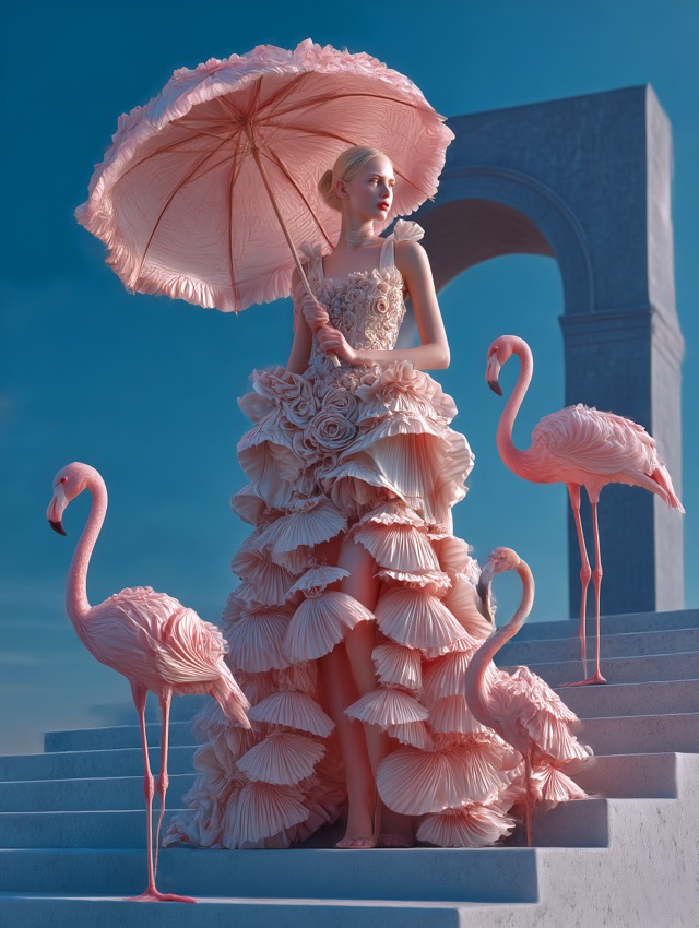 この作品について どこか時間が止まったような空気の中で、静かに存在感を放つビジュアルに仕上がった。柔らかなピンクのフリルドレスをまとった女性が、同色のフラミン... -