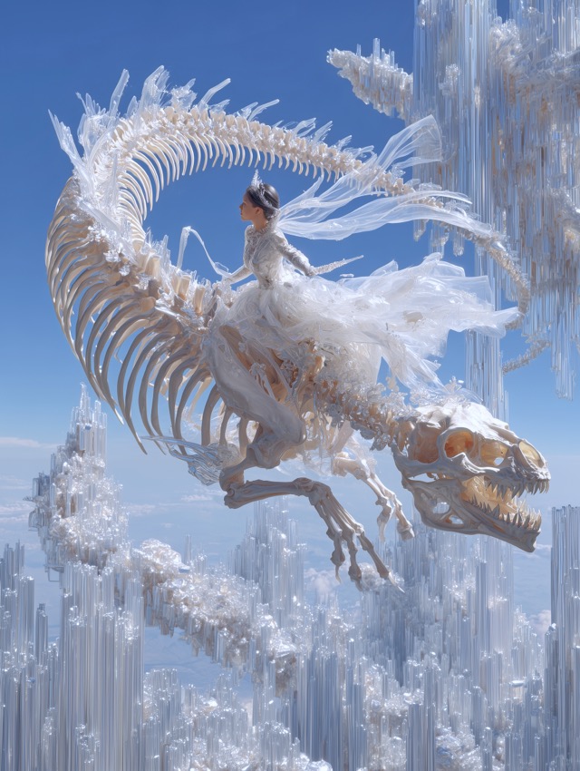 透明な骨のドラゴンと少女が舞う幻想世界