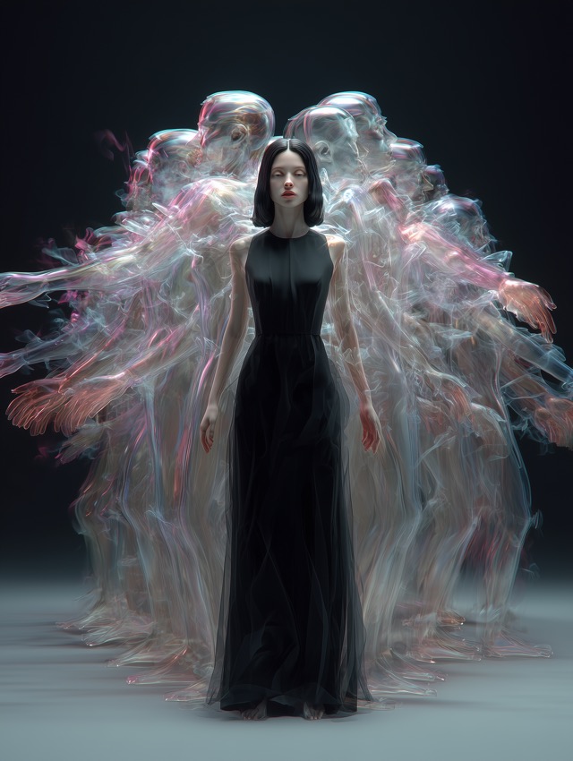 この作品について 正面に立つ黒ドレスの女性の静けさが、背後に広がる半透明の人影をいっそう際立たせています。視線がまず中央に集まるのは、無駄のない縦長のシルエッ... -