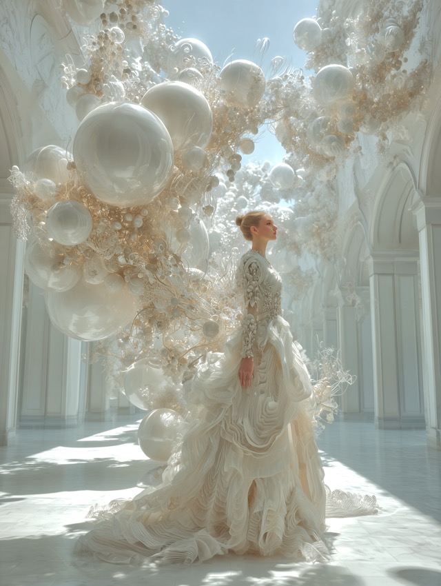 この作品について 静寂に満ちた白い回廊の中央で、ひとりの女性が横顔を空へ向けています。印象を決定づけているのは、頭上から背後にかけて逆三角形に広がる巨大な球体... -