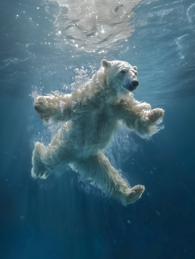 この作品について 深い青の世界に差し込む光の筋、その中心で白いシロクマが静かに四肢を広げています。水面は頭上で揺らぎ、きらめく粒子が降り注ぐなか、分厚い毛並み... -
