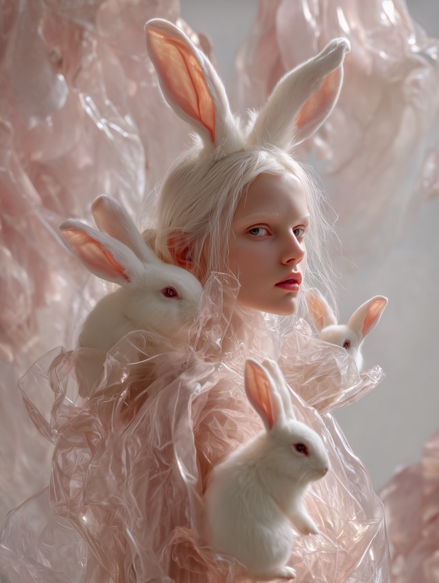 この作品について ふと笑ってしまう軽やかさがありながら、しっかり視線を引きつけるシュールなポートレートに仕上がりました。やわらかな光の中で、白い服を着た女性が... -