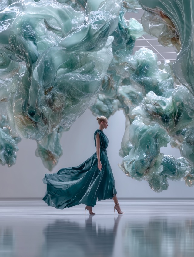 巨大構造の間を歩く青緑の幻想 この作品について ふと目に入った瞬間に、人物の静けさより先に空間の異常な密度へ引き込まれる作品です。魅力の中心にあるのは、青緑が... -