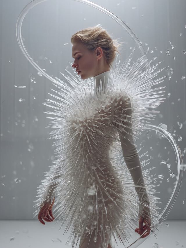 この作品について ふと目を止めた瞬間に、静けさより先に気配が伝わってくる一作です。白に近い淡い空間の中央で、横顔を落ち着かせた女性の身体を、無数の透明な棘が胸... -