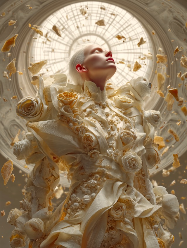 光輪の下で咲く白薔薇の幻想 この作品について ふと見上げた瞬間のような神聖さを、一枚の中に閉じ込めた作品です。視線を引き寄せるのは、頭上に大きく開いた円形天窓... -