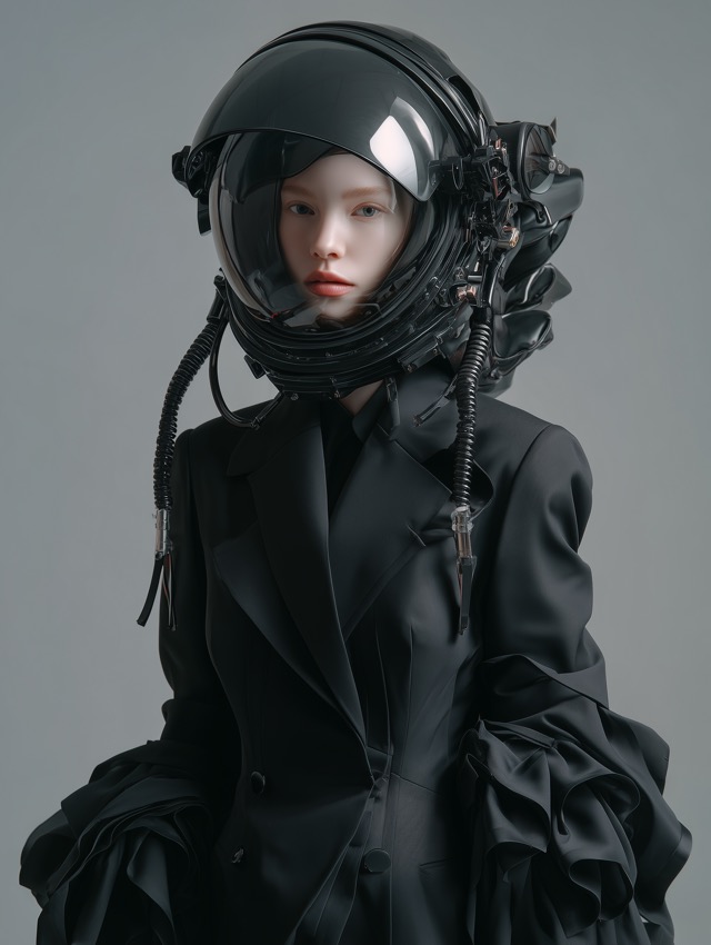この作品について まず目を引くのは、宇宙服を着ているはずなのに、機能性よりも美しさそのものが前面に出ていることです。なぜなら、この作品では光沢のある黒いヘルメ... -