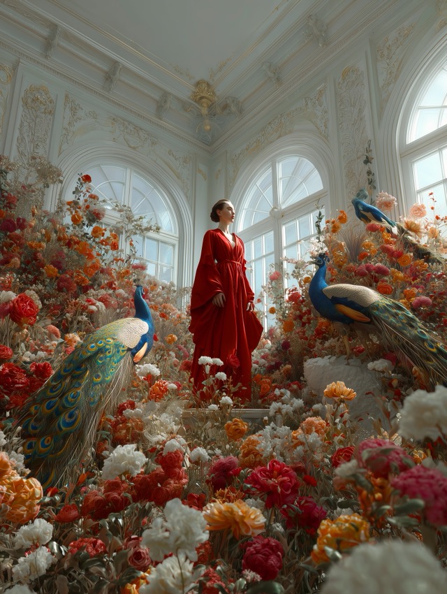 この作品について まず心を奪われるのは、宮殿のような白い室内が、整えられた部屋ではなく花畑そのものへ変わっていることです。なぜなら、高いアーチ窓から差し込むや... -
