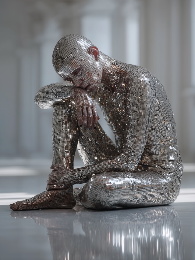 この作品について まず惹かれるのは、冷たい質感で覆われているのに、ただの無機物には見えないところです。なぜなら、この作品では全身が細かな銀のタイルのような反射... -