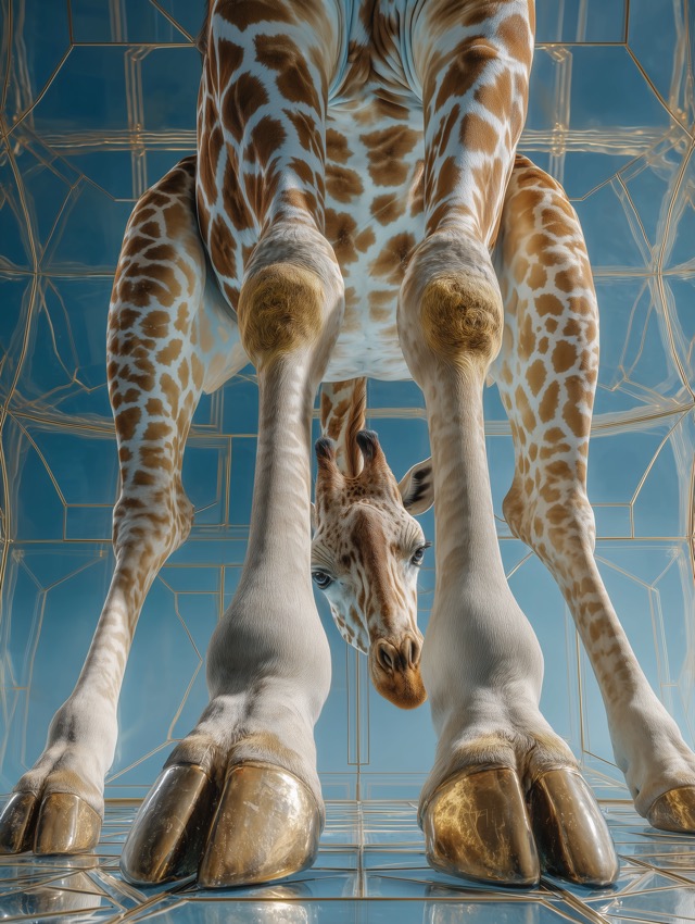 この作品について 最初に目を奪われるのは、見慣れたはずのキリンが、まるで別の生き物のような迫力で迫ってくる点です。なぜなら、この一枚は普通の横顔や全身像ではな...