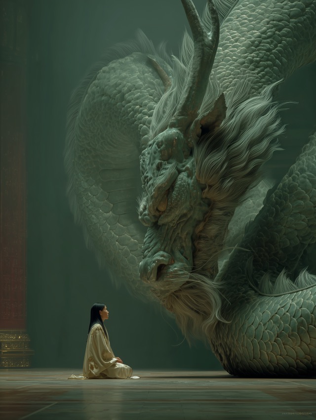 この作品について まず圧倒されるのは、この場面が壮大なのに、驚くほど静かだからです。理由は、巨大な龍と一人の女性が、対立ではなく、まるで呼吸を合わせるように向... -