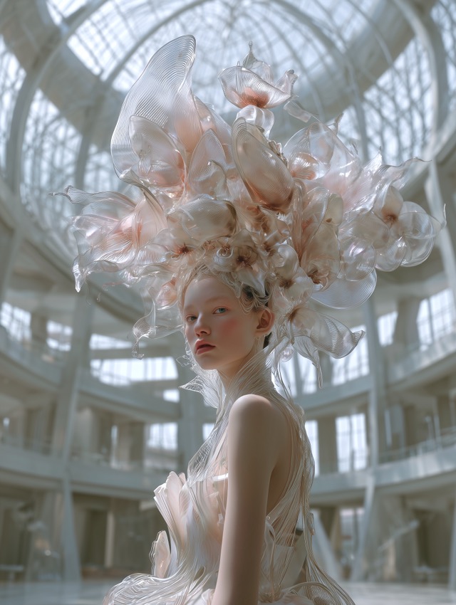 この作品について まず目を引くのは、人物そのものよりも先に空間へ咲き広がる巨大な花のヘッドドレスです。そう感じる理由は、淡いピンクを含んだ半透明の花弁が何層に... -