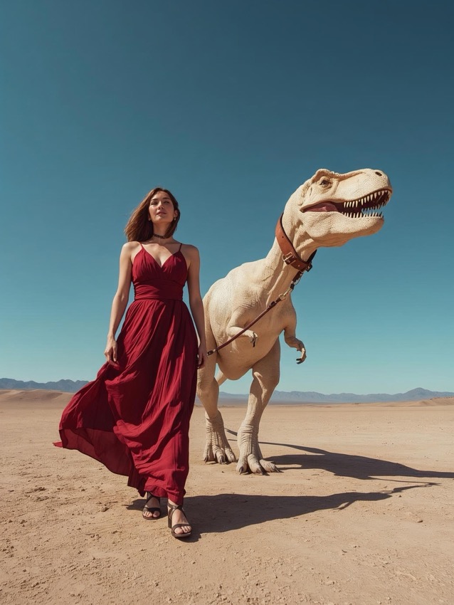 赤いドレスと白い恐竜の砂漠散歩