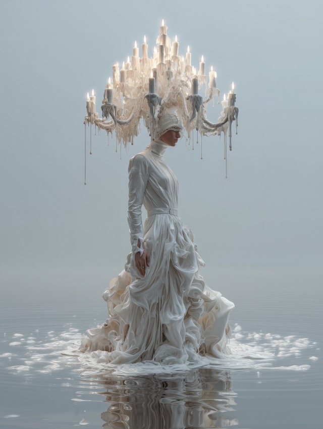 この作品について この作品の独自性頭上に巨大なシャンデリアを載せた人物像を、ただ奇抜な装飾としてではなく、白一色の世界で浄化の象徴として成立させている点がこの... -