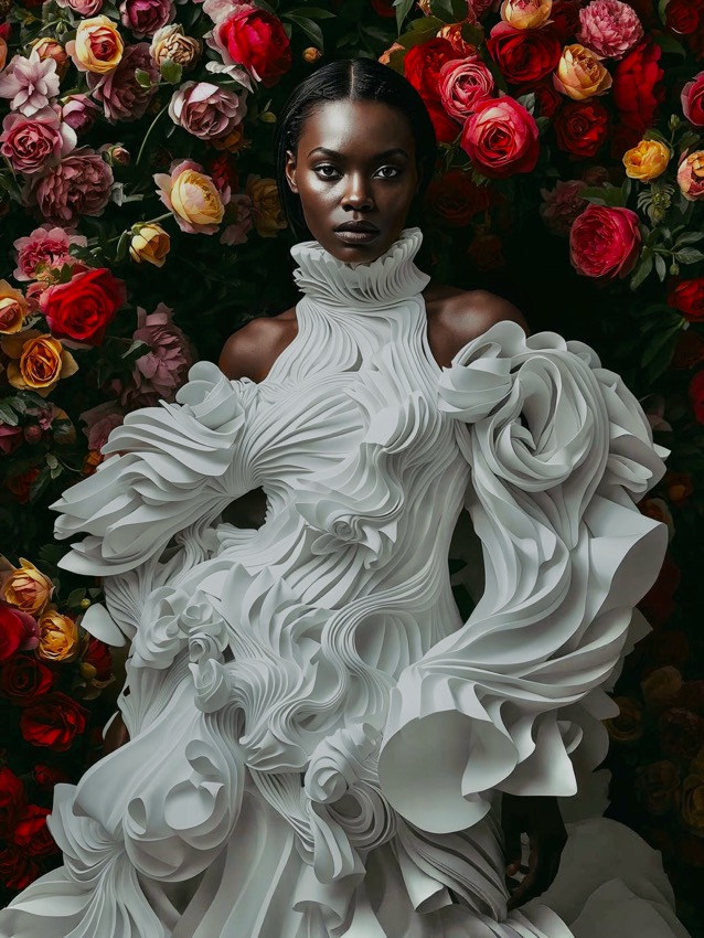 この作品について まず視線を奪われるのは、白という色がここまで強い存在感を持てるのかという驚きです。理由は、花で埋め尽くされた濃密な背景の中に、3Dプリンターで... -