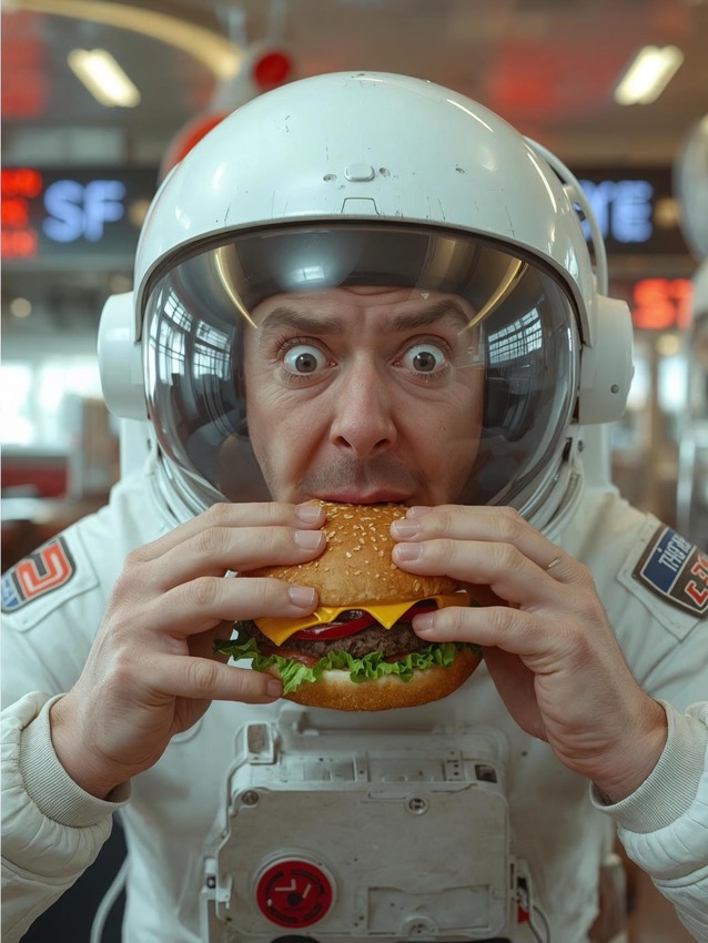 この作品について ぱっと見た瞬間に笑ってしまうのは、非日常の象徴があまりにも日常的な困り方をしているからです。理由は、白い宇宙服に身を包んだ宇宙飛行士が、明る...