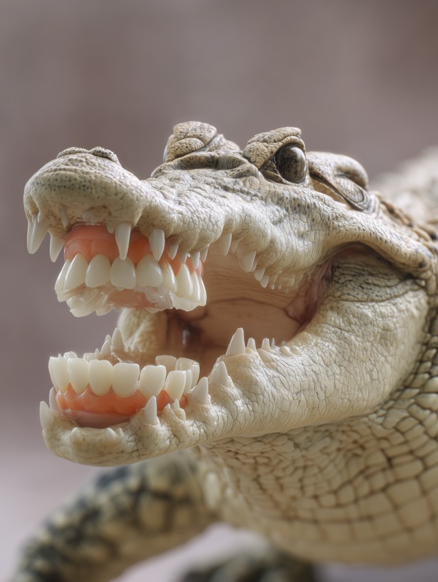 この作品について 見た瞬間に頭が一瞬止まるのは、このワニがあまりにも本物らしいのに、口の中だけが妙に人間的だからです。理由は、しわの入った厚い皮膚、乾いたうろ... -