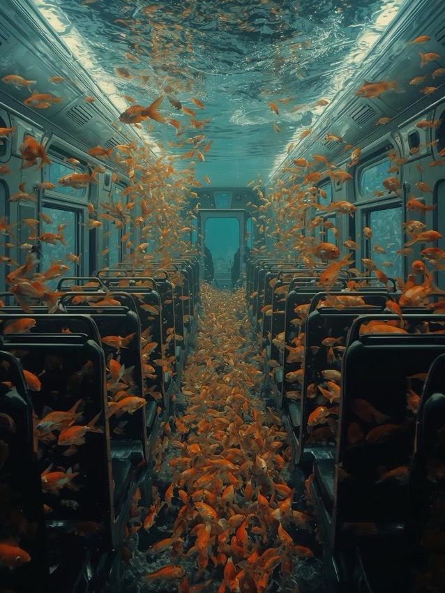 この作品について ぱっと見た瞬間に息をのむのは、この光景が美しいのに、どこか苦しいからです。理由は、誰もが知っている満員電車の車内が、今度は大量の金魚で埋め尽... -