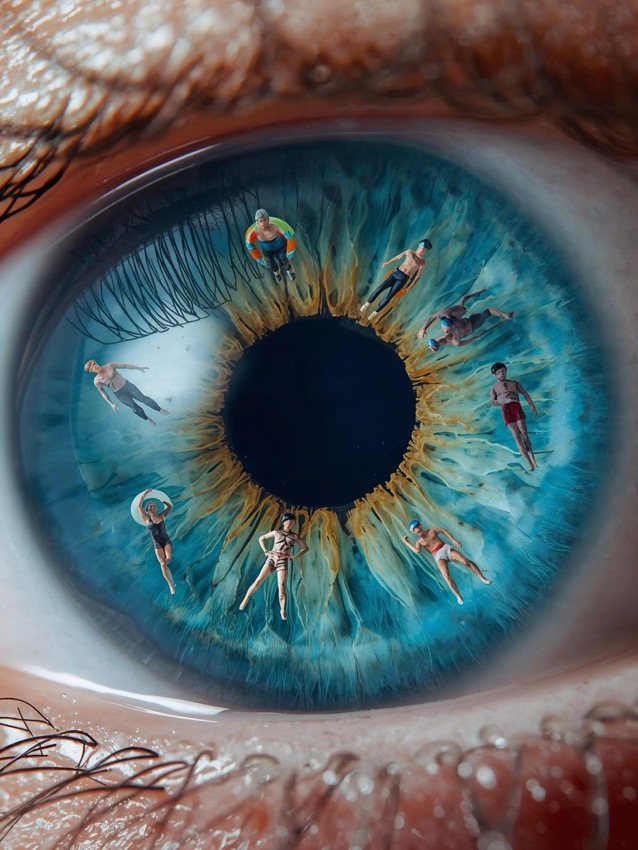 この作品について ふと見つめた瞬間に、ただの眼球マクロではないことがすぐに伝わってくる作品です。理由は、オーシャンブルーの虹彩の中に、小さな人々がまるで海辺で... -