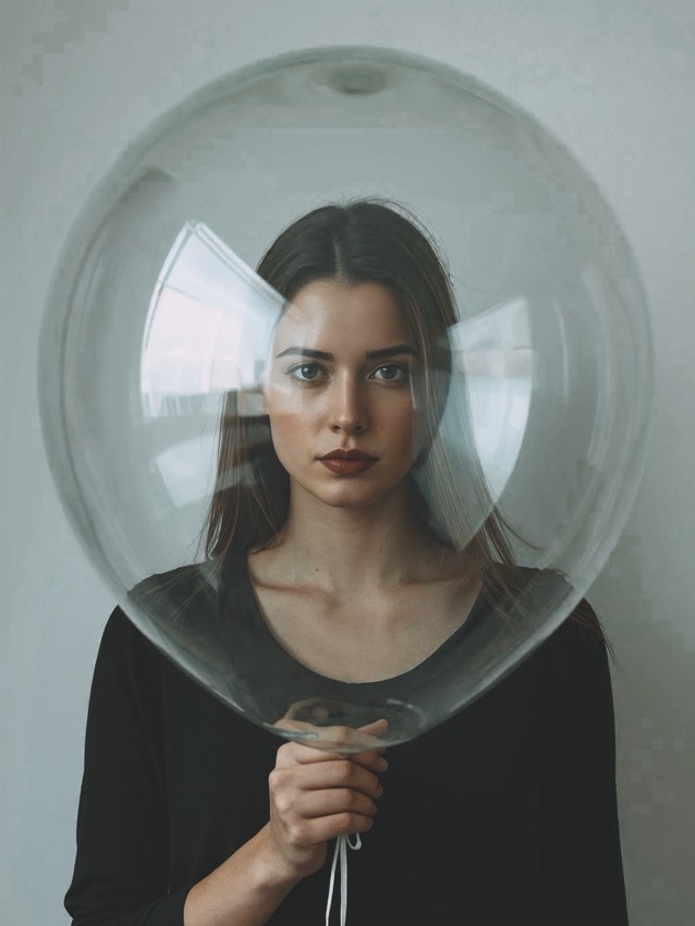 この作品について すっと視線が止まるのは、この作品が極端に静かなのに、はっきりとした違和感を抱えているからです。理由は、正面を見つめる女性の顔の前に、巨大な透... -