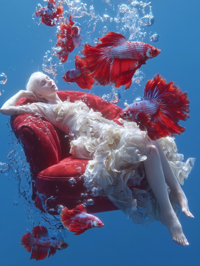 この作品について まず視線を奪うのは、青い水の中に浮かぶ赤いソファと、そこに身を預ける白い女性の対比です。結論から言えば、この作品はベタとアルビノの女... -