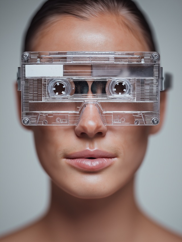 この作品について ぱっと見では近未来的なアイウェアに見えるのに、よく見るとそれが透明なカセットテープになっている。この意外性こそが、この作品のいちばん大きな魅...
