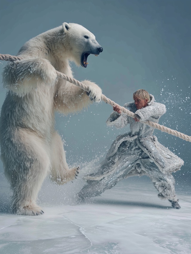 この作品について まず目に入るのは、現実では絶対に起こりえない対決の形です。結論から言えば、この作品は白熊と人間が綱引きをするという異常な設定を、迫力ある一枚... -
