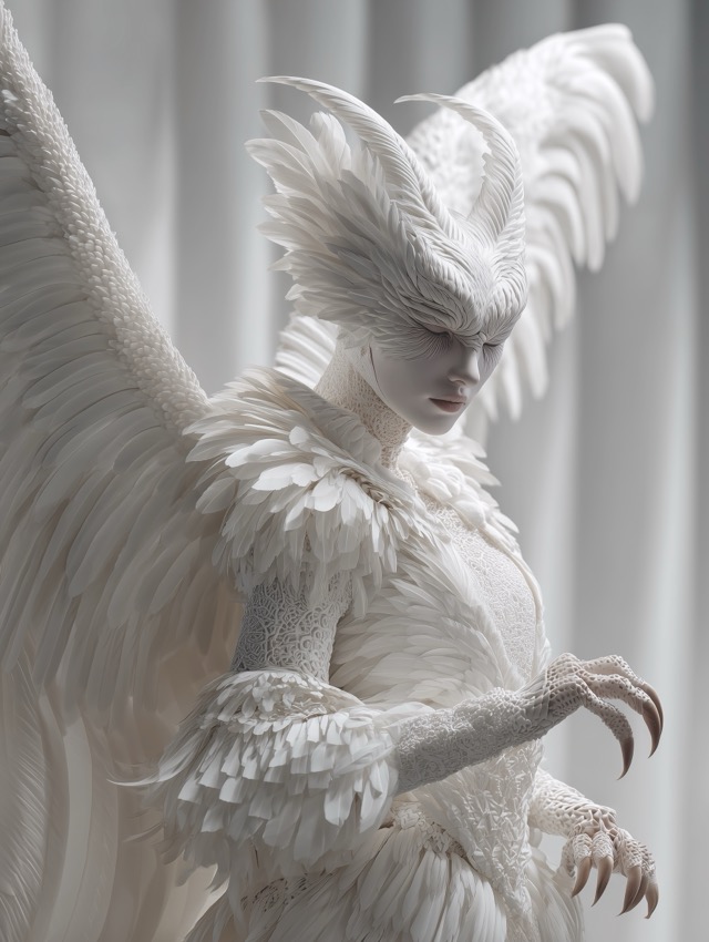 この作品について 目を奪われるのは、まず圧倒的な白の存在感です。結論から言えば、この作品は天使のような美しさの中に、ハーピーという危うい本質を潜ませたダークポ... -