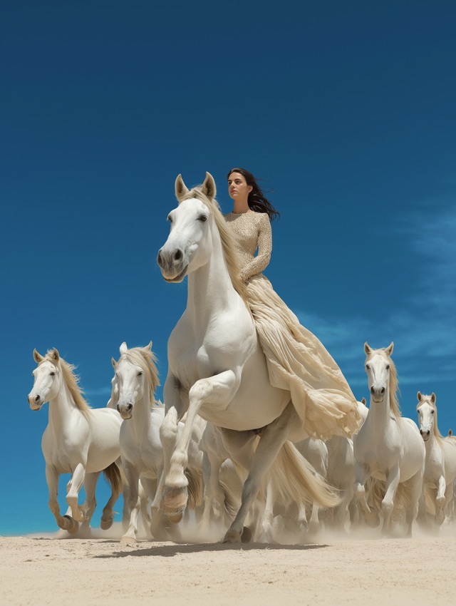 この作品について 最初に目へ飛び込んでくるのは、どこまでも抜けていくようなターコイズの空です。結論から言えば、この作品は白馬の群れと女性の堂々とした存在感を、... -