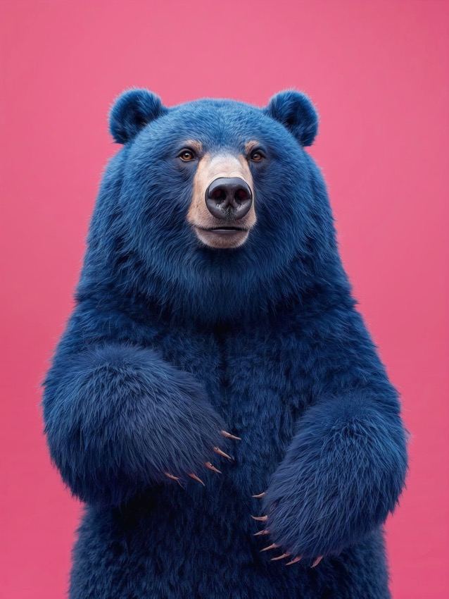 この作品について まず目に飛び込んでくるのは、鮮やかなピンクの背景に立つ、深い青色のクマです。なぜ印象が強いのかというと、現実には存在しない色をまといながらも... -