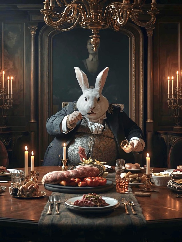 この作品について 目の前に現れるのは、ただの白いうさぎではありません。結論から言えば、この一枚は不気味さとユーモアを同時に味わえる幻想ディナーのAIアートです。... -