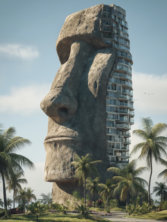 この作品について この作品の魅力は、巨大なモアイ像の内部にマンションが融合しているという強烈な視覚的サプライズにあります。なぜなら、古代の石像と現代の住宅建築... -
