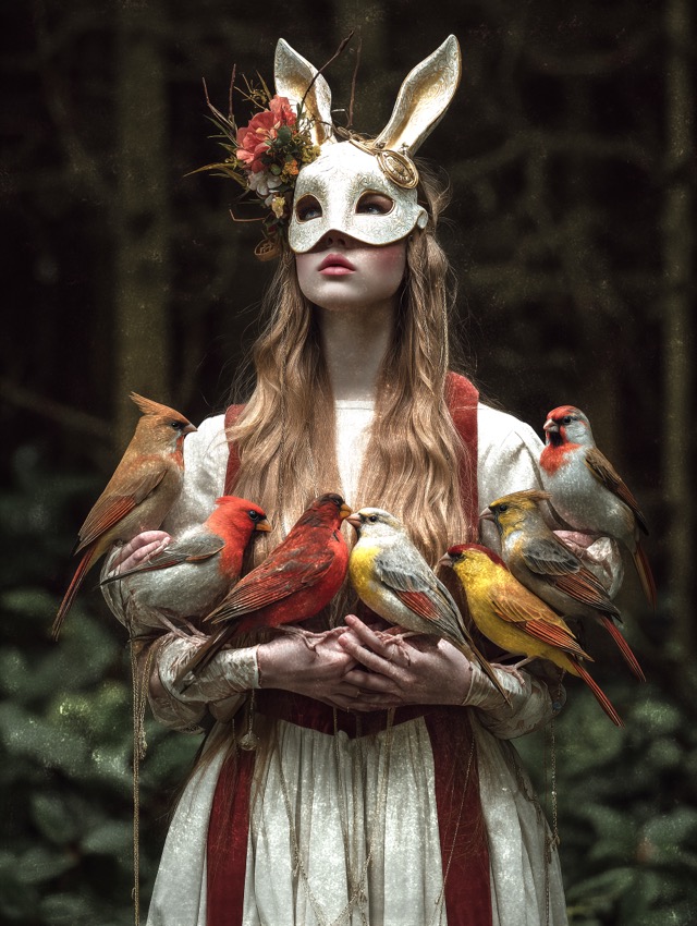 この作品について この作品の魅力は、女性がまるで鳥たちを手懐けているかのように静かに集めている不思議な瞬間にあります。なぜなら、自然界では警戒心の強い鳥たちが... -
