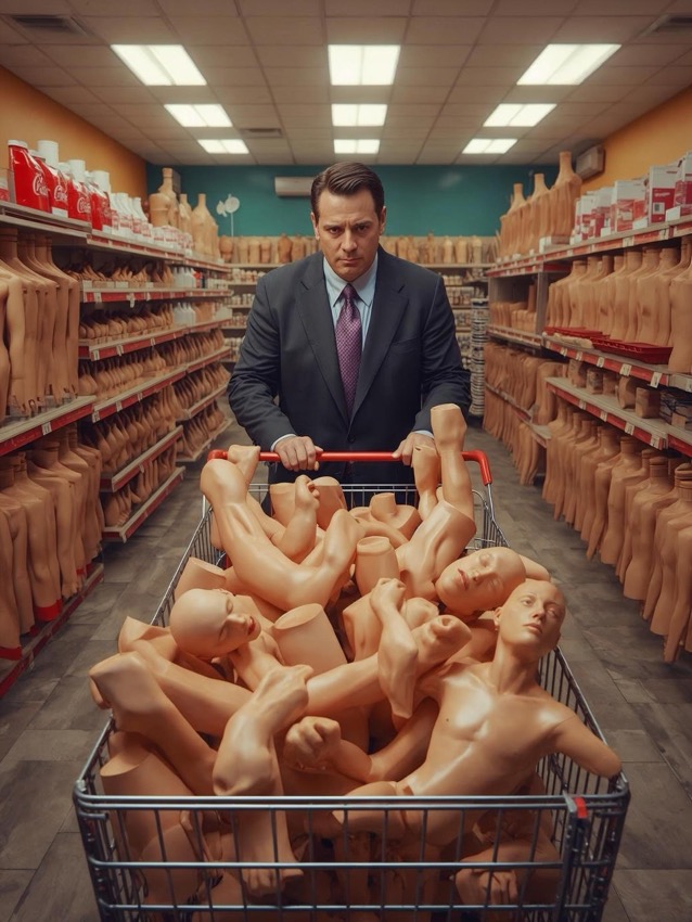 この作品について この作品の魅力は、スーツを着た男性がマネキンのパーツを大量にカートに入れているという奇妙な状況にあります。なぜなら、一見すると普通の買い物の... -