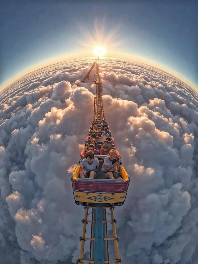 この作品について この作品は、雲を突き抜けるジェットコースターという圧倒的な存在感そのものを描いた作品です。なぜなら、遊園地の乗り物という身近なモチーフを、空... -
