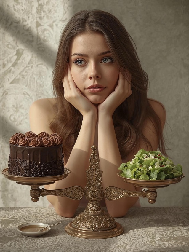 この作品について この作品は、誰もが経験する「食べたいもの」と「体に良いもの」の葛藤を視覚化したビジュアルです。理由は、クラシックな装飾の天秤の左右に、濃厚な...