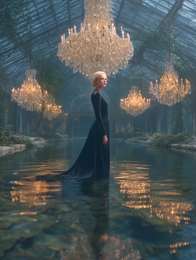 この作品について ふと足を止めたくなる静けさを、一枚の中に閉じ込めた作品です。視線を引くのは、水に満たされた温室の中央で黒いロングドレスの人物がまっすぐ立つ姿... -