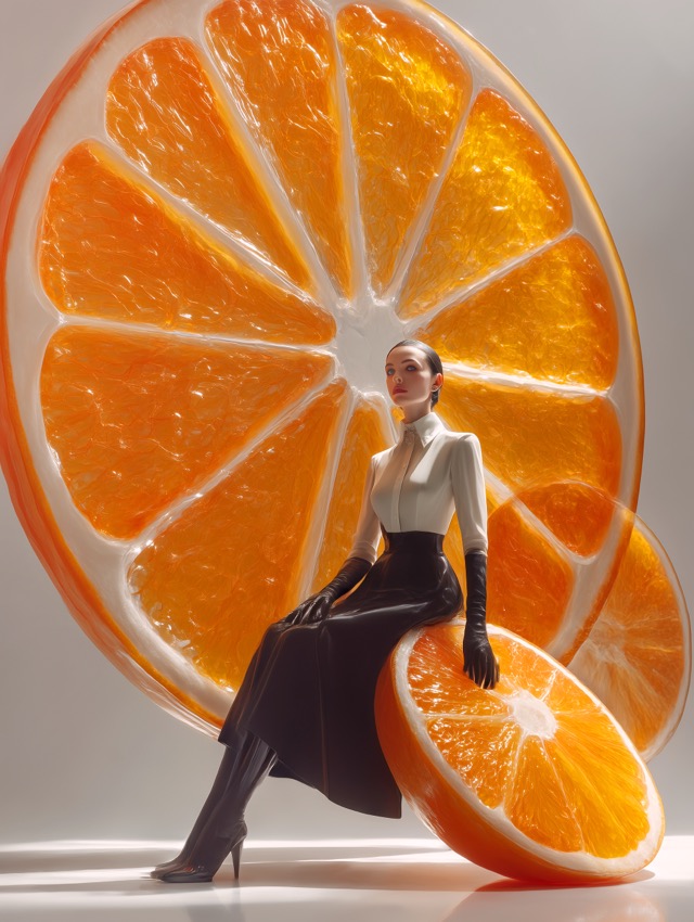 この作品について まず視線をつかむのは、人物の背後で大きく発光するオレンジの断面です。印象が強く残るのは、果実の瑞々しさと、白いハイネックのトップス、黒いロン...