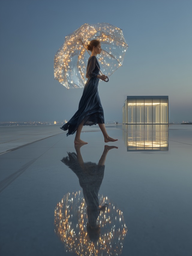 この作品について 静かな夕暮れの屋上に、発光する透明な傘を差した女性がひとり歩く。その印象を支えているのは、光そのものよりも、光が床にどう返ってくるかまで設計... -
