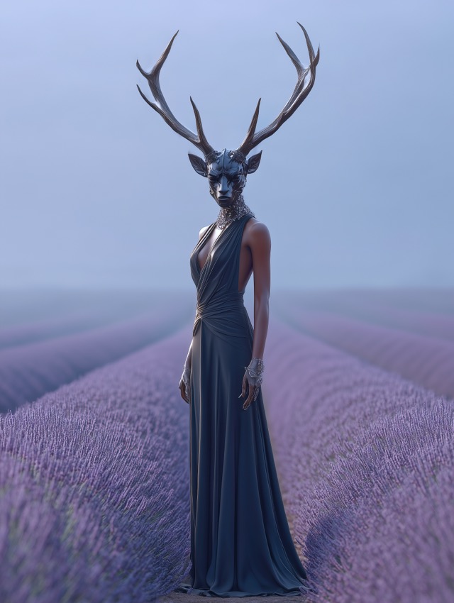 この作品について 朝霧に沈むラベンダーの畝の中で、黒のドレスと巨大な枝角が静かに立ち上がる一枚に仕上がりました。印象が強いのは、青白い空気に包まれた背景、足元... -