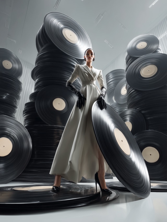 この作品について 目に入った瞬間に空気の重さまで伝わる一枚です。強さの理由は、黒いレコードを単なる小物ではなく、天井近くまで積み上がる柱のような存在に変え、そ... -