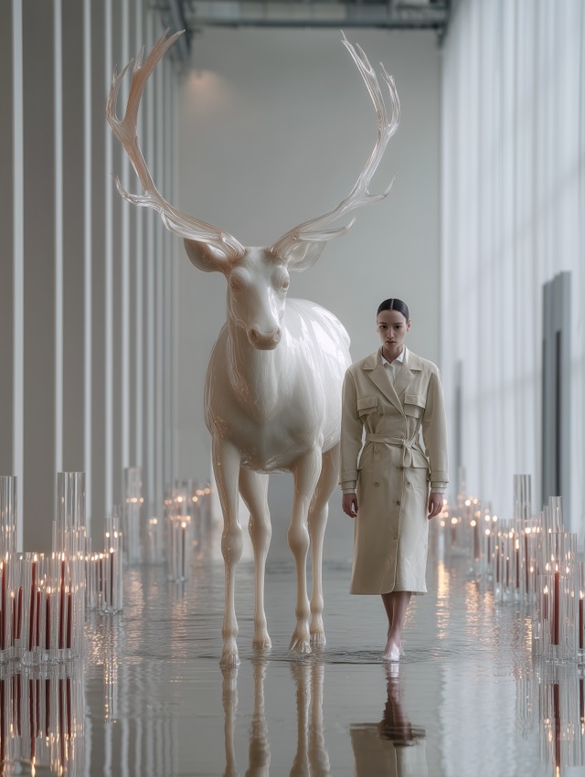 この作品について 静けさが、最初の一瞬で空気ごと伝わってくる一枚です。視線を引き寄せるのは、磨かれた彫刻のように白く大きな鹿と、その隣を歩くベージュのトレンチ... -