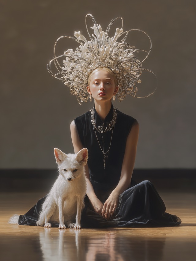 この作品について ふと目を止めた瞬間に、静けさと緊張感が同時に入ってくる一枚です。画面の強さを支えているのは、正面を見つめる人物の顔、足元に寄り添う白い狐、そ... -