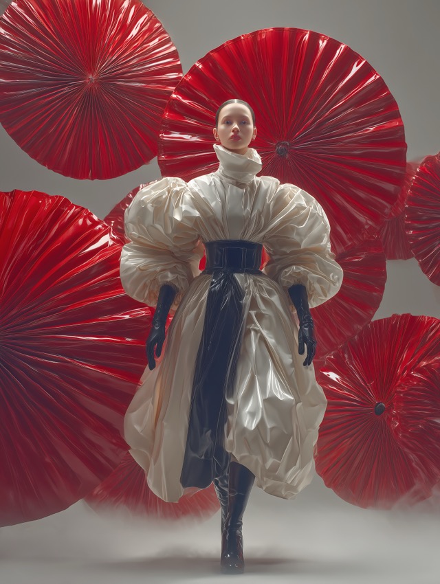 この作品について ふと目を奪われるのは、巨大な赤い扇が幾重にも開いた空間の中央を、白いクチュールドレスの女性がまっすぐ歩いてくる構図です。印象が強く残るのは、... -