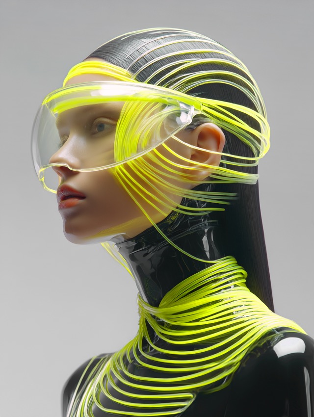 この作品について 静かな灰色の背景の中で、最初に視線を奪うのは、顔を包み込むように伸びた透明バイザーと、蛍光イエローの発光ラインです。黒く艶のあるハイネックの... -