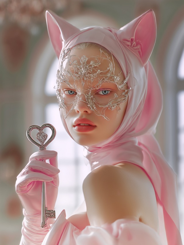 この作品について ふと足を止めたくなるのは、甘さの中に緊張感が潜んでいるからです。淡いピンクの猫耳フード、顔の輪郭に沿って広がる繊細なシルバーのマスク、ハート... -