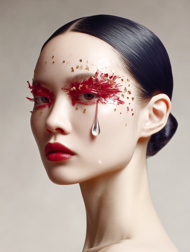この作品について ふと目を奪われるのは、整いすぎた美しさの中に、わずかな異物が差し込まれているからです。黒髪をぴたりと撫でつけたシニヨン、赤く鋭く広がる目元、... -